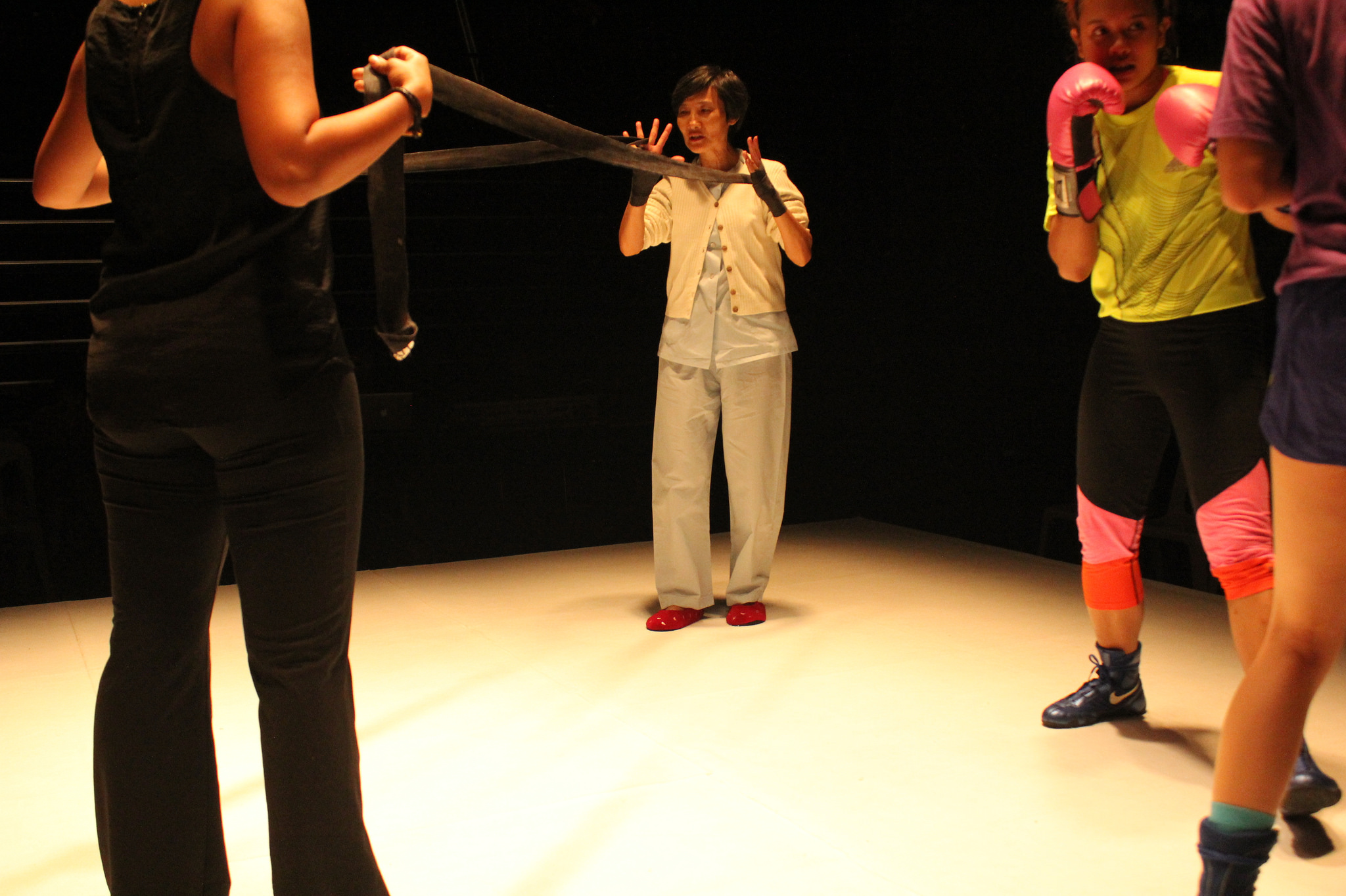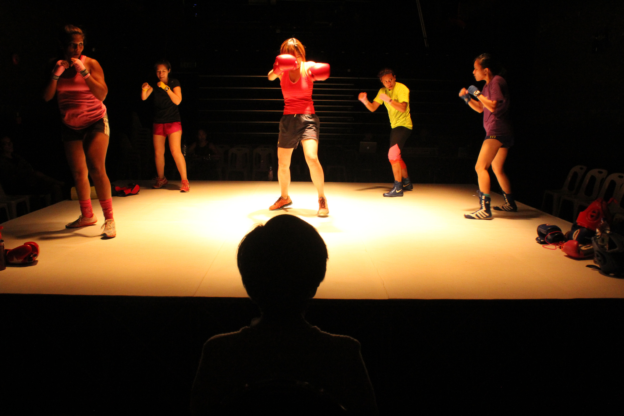 在看戏之前,我了解了一下Director’s Lab。它是电力站发起的,一个针对本地艺术家的发展项目。它让艺术家用18个月的时间,搜集和研究资料,在导师的指导下,发展出一套属于他们自己的,独特的导演手法,再运用到剧场作品中。这个项目从2012年底发布开始,经过了挑选参与者,师徒配对,以及多次的交流对话,最终于今年3月,进行了最终的表演呈现。而Pat发展的导演手法,是用竞技运动——拳击,来作为演员身体训练的方法,也作为创作理念的开端,探讨女性和暴力。