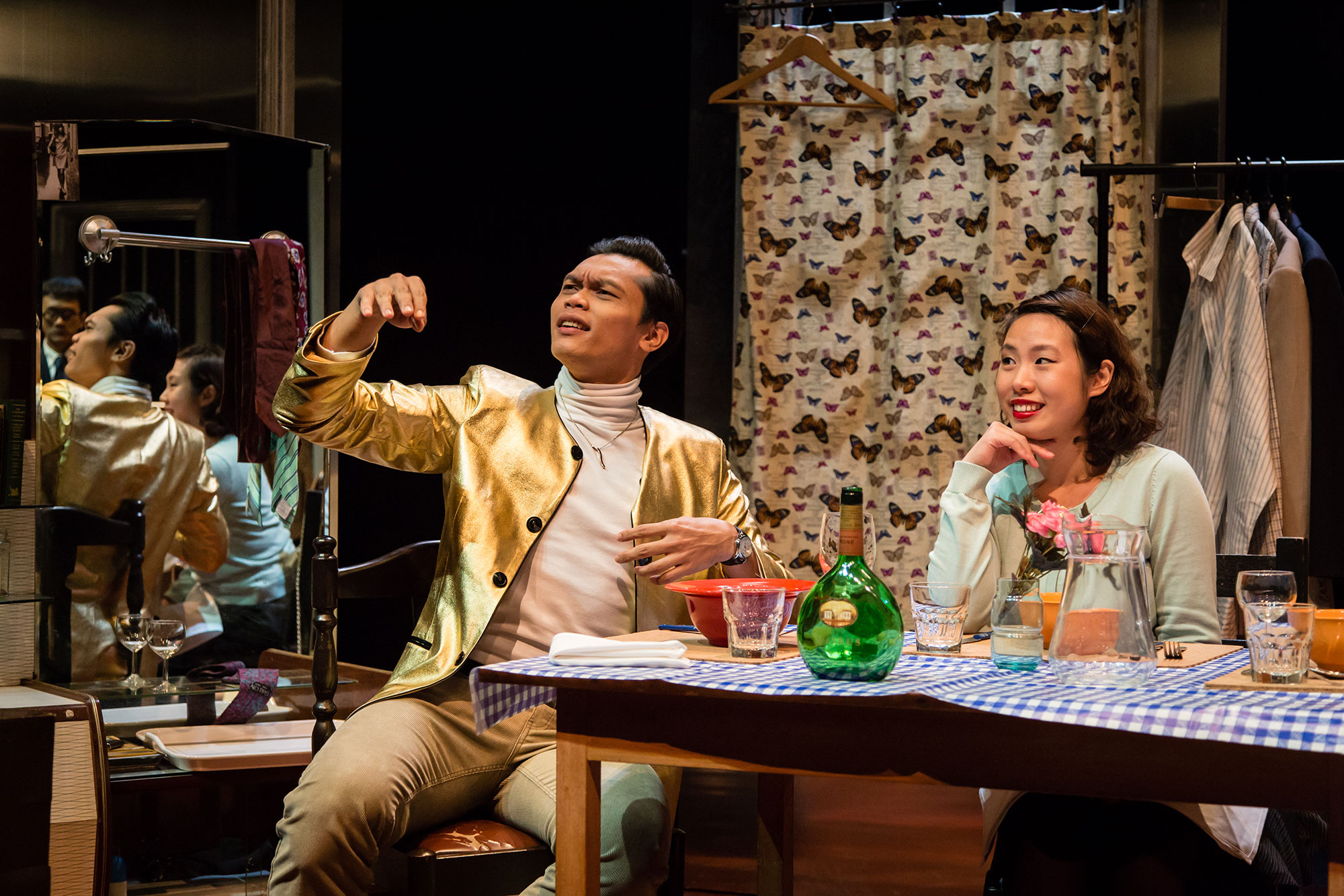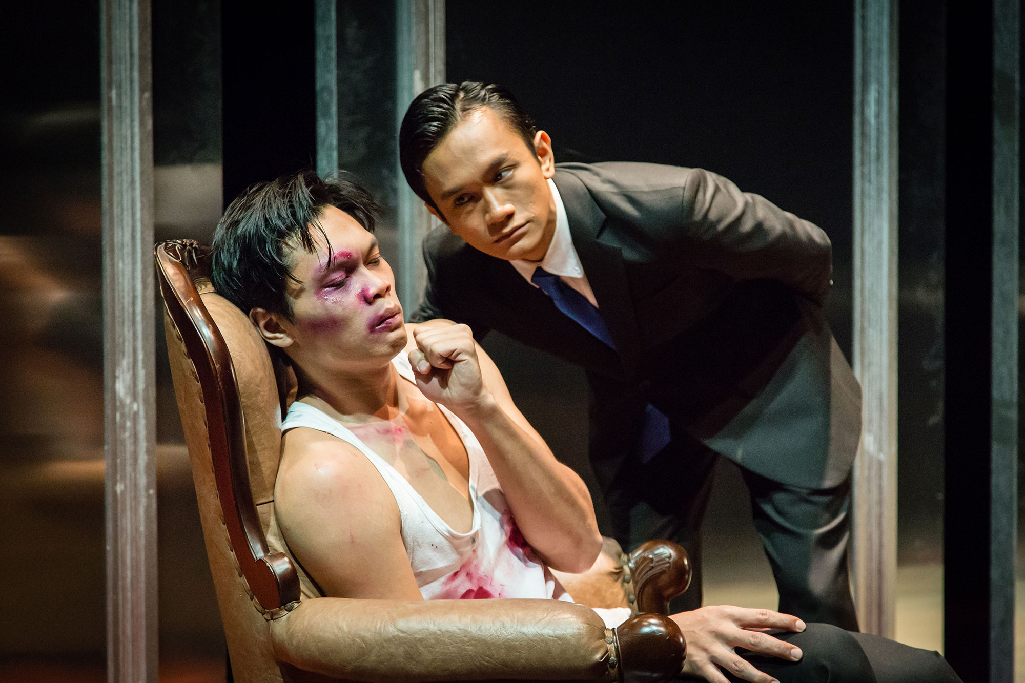 第一段的品特《餞行酒One for the road》,他們詮釋成了一等邊正三角形,看得人怵目驚心。燈亮我們就看到Yazid Jalil詮釋的病態施虐者Nicolas面目猙獰的坐在辦公桌前,和一罐他之後在對話的過程中會不斷飲用的Johnny Walker ,門打開,走進一個步履闌珊,全身顫抖,血跡斑斑的Victor(Al-Matin Ya Tim飾演),坐也不是,站也不是的受盡折磨,讓人毛髮直豎。儘管發言量極大的Yazid看起來是主角,全身是傷的Matin也不甘示弱的用他的全身,和艱難的從齒縫中做出很多哼哼投入在這場戲裡, 舞台上只有兩個演員,兩個人的能量幾乎是要差一點就相撞那樣的強大,找不到呼吸的空檔,直到戲走到了孩子Nicky,觀眾才找到喘息的空檔,接著是Chang Ting Wei 和Yazid的對手戲,Chang飾演Victor的妻子Gila,我們又再度進入在演員針鋒相對的對話中,屏氣凝神。兩個受虐的弱者不甘心,不服氣,一心求死的能量幾乎是要那個變態的施虐者站成三個等角三邊形,幸而施虐者Yazid的詮釋中看出了施虐者吊兒郎當的氣質中有種自嘲,才沒有使這個等邊三角形太重而失去耐人尋味的空間。