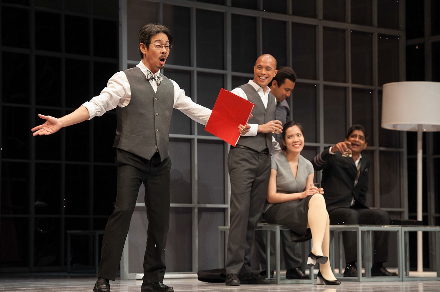 演出进行时,舞台上的场景由许多能上下移动的墙板依据故事情节组合而成。这些墙板采用了半透明材质,加上灯光的辅助,使舞台呈现一种带有现代感、华丽又简洁的视觉风格。这个设计概念让我感觉到一种不实在的奢靡,仿佛一个表面亮丽但内里虚浮的物质化社会。这些半透明的墙板更让我联想到写实戏剧里常被提到的“被拿掉的第四面墙”。它们时而掩饰,时而揭露,使我们总是在“看得见”与“看不见”之间徘徊。这是在暗示观众要努力看穿社会的层层外墙吗?