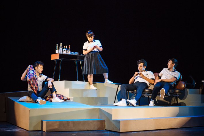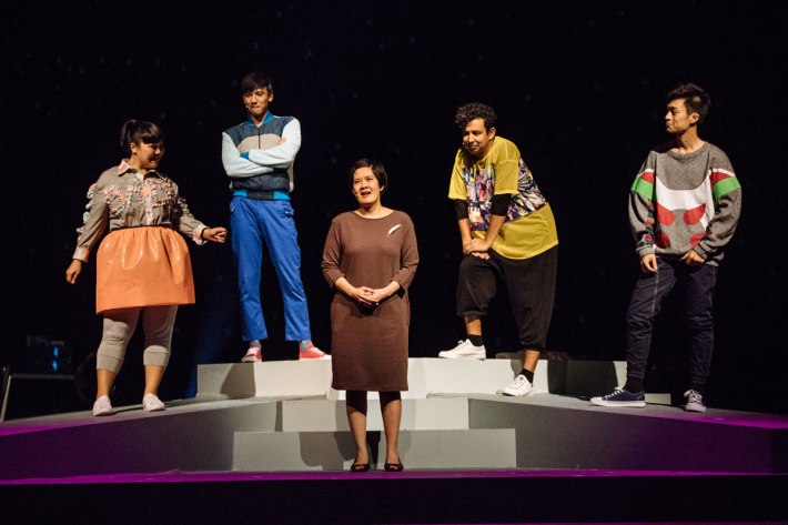 但是在我看来,这样的安慰只有短期的功效。除了让人感同身受,剧组还通过舞台设计提出值得深思的一点。在单纯的校园生活叙事过去之后,舞台上的时间开始倒带和快转,空间也开始转移。我说的“转移”,是真的有东西在转。舞台中央是一个旋转台,重要的场景都被设置在这个旋转台上,根据场次的变动而把场景转向观众。旋转台上还有一些不规则的斜坡和阶梯,充当人物在不同场景之间走动的虚拟走道。这个设计除了让换场比较方便,更重要的是它使舞台变成一个多层次的平台,让不同的空间和时间可以瞬间转换甚至同时出现。校内、校外、家里、街上…;当下、过去、未来… 很多时候,当下和过去就直接在同一秒钟重叠了,到了下一秒钟又和未来紧紧相依,接着又绕回过去… 随着剧情的推进,时空在不断地来回流动中,戏中的老师和学生被置放于这个旋转台上,好像在审判台上接受大家的一场又一场的盘问和判决。而更无情的是,老师和学生的生命在流动,身份也在改变,就像演了儿子又要演父亲、演了学生又要演老师的演员们,角色身份来回转换,但是,他们始终离不开这个旋转台,离不开整个制度永无止境的轮回。