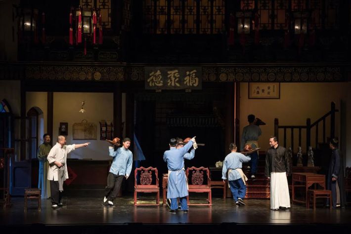 从情节来说,我眼前的更像是一出浓缩版电视剧(《天下第一楼》也确实有电视剧版),剧情可概括为“草根出身的职业经理人与富二代资本家之间的博弈”。虽然台词中出现了几个军阀,几个皇室,但是他们只不过是故事的点缀和噱头,就像爷爷辈酒过三巡吹牛时,也爱说自己当年曾与某某高官一起放牛。外面的社会变动,并没有对这饭庄里的人们造成什么本质上的影响。正是因为这样,剧虽分了三幕,幕与幕之间,人物心理与处境的变化都少了一点厚度。推动情节的总是催债与核账,除了当上了掌柜的卢孟实和被抄了家的克五,其他人的生活甚至都没有什么重大改变。同是清末民初,时代背景是《茶馆》的骨,是《天下第一楼》的衣。只要换个时代,《茶馆》的故事一定不会发生;但《天下第一楼》,却可以换个时代毫不违和地上演。