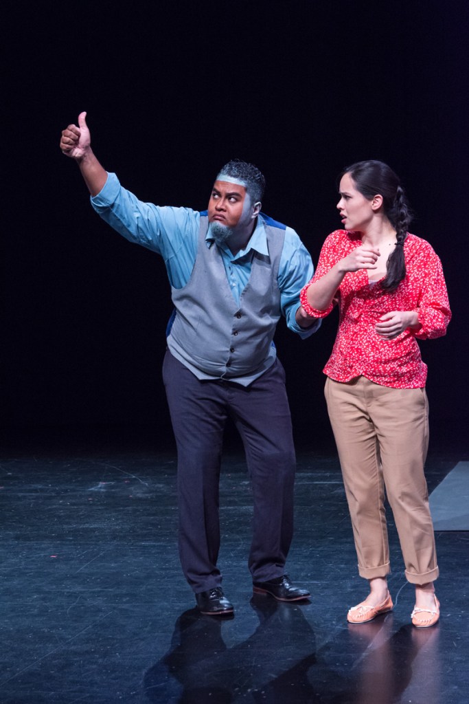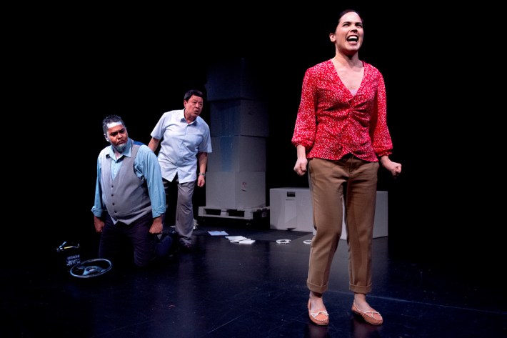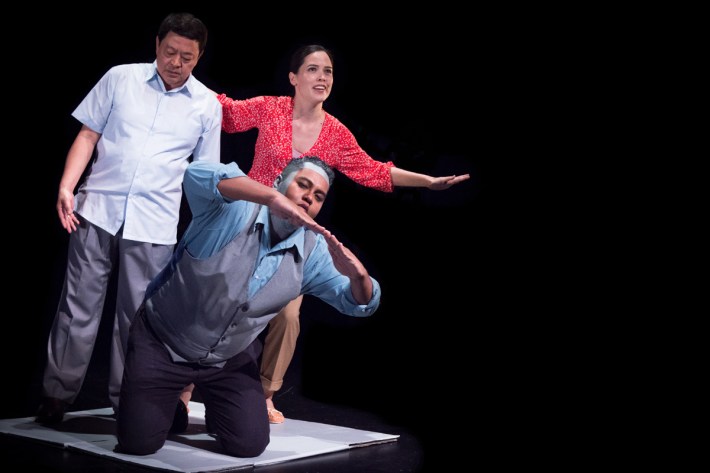 这是一部感觉“温温”的戏。舞台和道具是很简单的,但不是追求那种很风格化的极简,而是差一点就变成简陋(但又不至于),刚好够用就好。服装也是“温温”的,不是没有经过设计,也并非经过精雕细琢,也就是刚刚好。尤其是身兼“汽车”角色的两名演员,轻微地戴上简单的道具,就从“人类”变成“汽车”了,没有刻意强调机械感。甚至,整部戏的节奏也是“温温”的,不是缓慢,也不算明快。而且,长度刚好一个小时,时间走到差不多是观众需要休息的时候,戏就演完了。