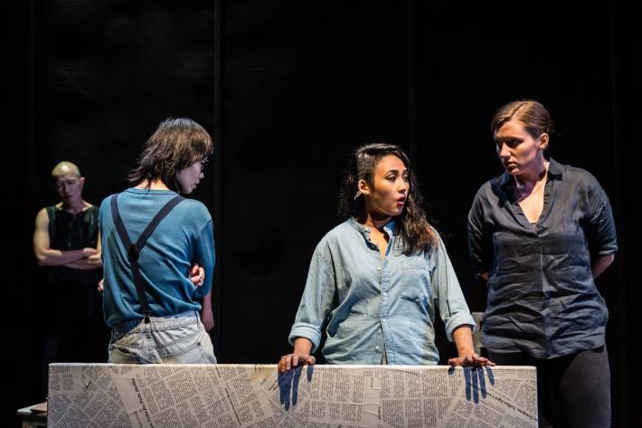 对于这部戏的主题和那两个问题,剧组展现出“下定决心”的姿态,看那八个为了演出而剃光头的演员就可以感受到。但干净光亮的头并没有带来清晰的逻辑,反而在混乱中越钻越深,问题的答案依旧不明朗,如同台上演员进进出出的那个“出口”那样,始终昏暗不明。然后我发现观众离开剧场时的灯光,和进来时一样,也都是昏暗不明。