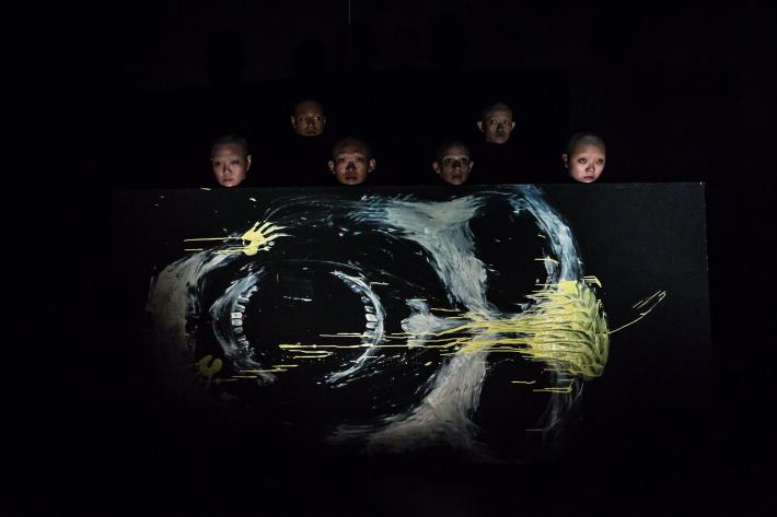 这部戏从一开始就很吸引眼球。昏暗的灯光,全黑的舞台地板、墙壁和背景。八个剃了光头的演员在这样的空间里非常夺目。舞台上方多了一层不知如何生出来的二楼表演区。经过各种传统表演艺术训练的演员们的独特并带有一点神秘感的肢体形态和节奏。甚至还有演员在现场徒手和用油漆卷筒作画。多种呈现方式合力塑造了这部戏的空间和气氛。眼前这番景象给我的讯息是:我们身在故事主角的脑中,这是他的思维空间。