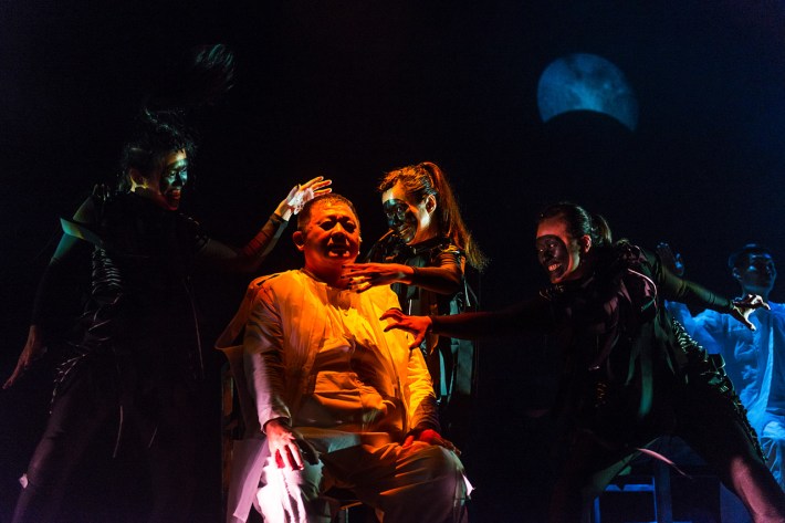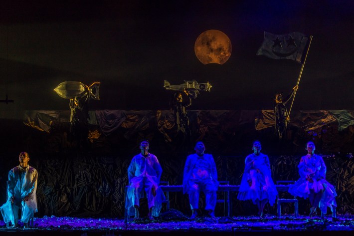 但是,这终究是一场戏。或许,《灵戏》的命运就是它名叫“灵戏”,它必须得是一场戏。从两年前的黑箱剧场来到今天更大更豪华的剧院里的镜框舞台,它作为一部“戏”的特性更加明确地显现出来。从舞台边框开始往里面延伸的台面是层层叠叠的平台,仿佛一座设计复杂的偶戏舞台。原本是立体的舞台空间,在视觉上被分割成多个正面对着观众席的平面,演员从左右两边进入舞台,行动也多数呈左右方向移动。举着“微笑”的旗帜、炮弹和飞机,以诡异动作和表情进出舞台的三只“黑鬼”们,也都是以这样的方式在舞台的前沿和后上方移动,施展他们对台上一切的掌控。在这场戏里,每个人物的肢体动作常常呈现僵硬的状态,犹如被操控的人偶。甚至像呼吸这么自然的一个动作,都被现场的强劲配乐控制着一呼一吸的节奏。在维多利亚剧院的舞台上,仿佛一部巨大的偶戏正在上演,暗示着在爱国热情的背后、在战争逻辑的背后,每个人都被控制着,可能被体制,或者不知何来的热情、某些人的权力、某个神话、个人的无知…… 控制着。