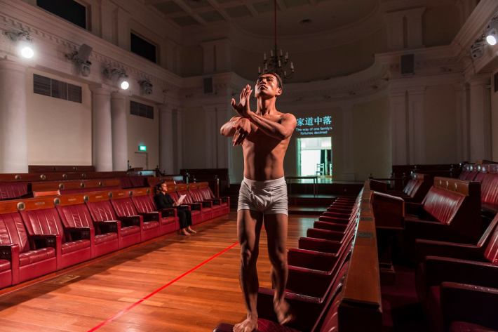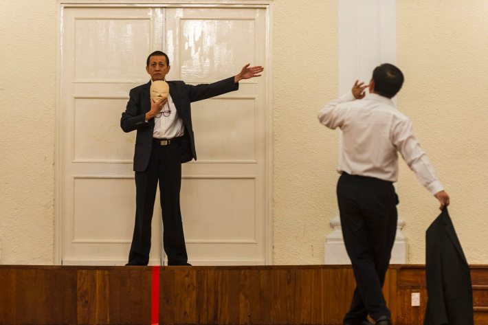 时间进一步推进,我们来到了一个关键的阶段。这也许是我们还未面对的未来。来自华欣的舞者Junior Dearden穿上黑西装,手持A4纸遮脸,从正前方的台上开始缓慢倒退行走。这似乎象征着一个僵化、“不进则退”的体制。在这个时候,来自金边的舞者Nget Rady以接近裸体的姿态现身。他像一个精灵般,无视议事厅里的严肃,踩上座位,爬上柱子,在厚重的议事厅内轻盈地奔跑飞跃。同时,空气中回荡着建筑工地里敲打的声音。这似乎象征着在未来的某个时刻,新的灵魂即将降临,拆解这个墨守成规的体制以及已经没有在讨论任何事情的讨论空间。荣念曾执导的这部戏虽然名叫《中国文化的深层结构》,但作为今晚的最后一部戏,在我看来更像是在敦促我们思考这个空间以及我们所处的这个社会的未来,是否在必要的时候,拆解和重塑我们的讨论空间?一个制度愿意推翻自己吗?