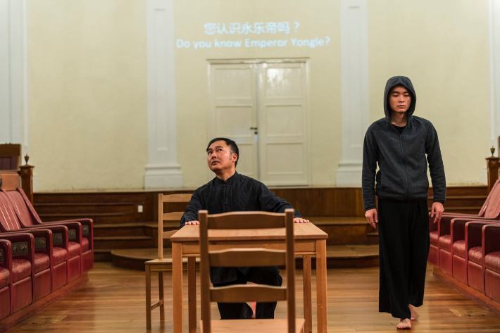 接下来是佐藤信执导的《站2017》,气氛已变得紧绷激烈许多。年纪较轻的刘晓义在这里碰上较年长的王斌,这个跨世代的相会似乎少了理解,多了摩擦。两者各自以自己的节奏行动,且偶尔发生碰撞。眼神虽有对上,但似乎没有交汇。年轻的一方全程以外套的帽子套着头,展现孤僻自傲的态度。面对面谈判的时候,双方没有付出努力改善彼此理解,年轻的一方更以嘲笑回应。不但如此,双方更自称永乐帝和建文帝,看来这世代之间的对立应该是难以缓解的了。来到这个阶段,这个讨论空间碰上了“代沟”这个难以跨越的隔阂。