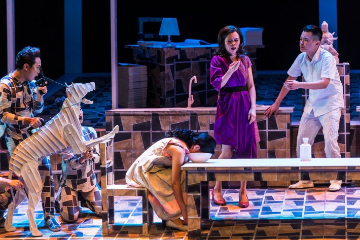 演员在这个虚实相间的空间里演出,以及在运用那些无形的道具的时候,拟真和夸张之间拿捏得当,刚刚好足以召唤观众的想象力。阿绣一个动作就把整锅菜分到盘上,再补上一声“哇~!”;小翠睡着了把脸泡在鸡汤碗里;还有恶心又滑稽的“换心”和“洗肠”过程等等,这些很“假”的设计,还有强调“假”的力度,加上种种空间上的留白,都是在剔除幻觉,不让观众沉溺在剧情张力中,并呼唤观众的知性和想象,去创造一间属于自己的屋子、一个属于自己的故事。