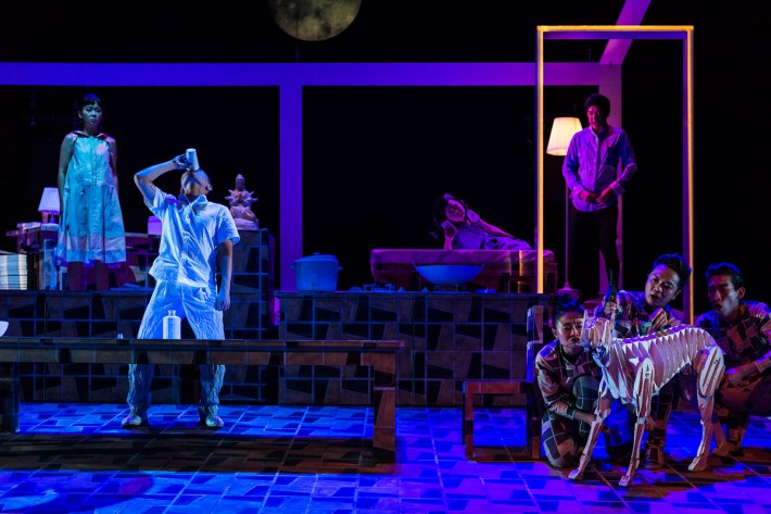 对,这部戏的“循环”是不一样的。《灵戏》的循环是生生不息的。《大狗民》的循环是把人转向毁灭。灯光设计所采用的色调或许已经暗示了这个“毁灭”,甚至是“末日”。在《灵戏》里营造地狱景象的紫色和蓝色灯光在《大狗民》中再次发挥相近的功能。故事虽然发生在阳间,但可以感觉到阴气不断渗透进来。还有瘦到好像可以看到骨头的白狗、简陋的屋内陈设,都在暗示一个灭亡的前夕。然后我发现这间屋子好像是用纸造出来的,它的各种表面和棱角透露着单薄、脆弱、崭新、没有生活气息的质感。这好像是一间纸扎屋?是给台上人物的,还是给我们的?