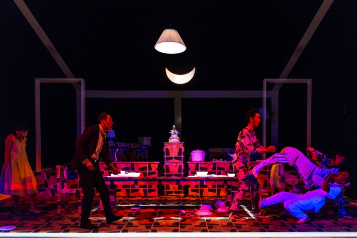 演出没有给我们明确的答案,或许这是它要保持“克制”和“点到为止”的原因。舞台以接近写实手法呈现,但处处均留一手,没有写实到底,甚至在某些地方还感觉有一点反写实的意味。屋子的墙、门和窗都是“隐形”的,只保留足以提示这些细节的框,我们可以自行填上想象中或记忆中的细节。还有,一整套均是白色的厨具和餐具、一整桌实际上不存在的食物、水龙头的水、炉火等等,都在我们脑中形成各自的形象。甚至连整间屋子的大小都是不确定的,地面是斜的,墙是梯形的,这是类似绘画里的透视法,制造深度的错觉。第一眼看似规规矩矩的屋子,其实它的面积可能随着观看的角度而改变。眼前这间屋子,很明显是假的。
