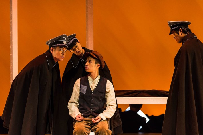 我想在这部戏里我们不会找到答案,至少不会直接找到。戏名是第一个暗示,它回避了“希特勒”这个大家印象深刻、具有历史感的姓,只用了他的名“阿道夫”,似乎在告诉我们这部戏无意处理希特勒的历史定位。我感觉到历史感是刻意被淡化的,尤其在视觉上,整个舞台设计得非常“轻”,实体场景道具非常的少,只有一些线条极简的门框、桌椅等等家具,还有悬挂在台上的抽象装置设计。在叙事中需要出现欧洲老街道的时候也只以轻盈的影戏呈现。“希特勒”出现了一次,但只是以某人假扮的一个角色形象出现。