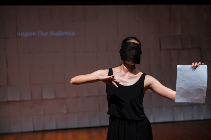 这部戏似乎有另一个更迫切的问题要解决。它在回应艺术/艺术家的现况以迎向未来。导演刘晓义让参与此计划的艺术家穿上黑色服装,男生更是一整套黑西装,看来是要严肃地面对问题。暗淡又沉重的黑西装,把他们的气场都藏了起来,看起来像枯燥又一成不变的公务员。(我不否认现实中有充满活力的公务员,但我眼前这几位不是。)他们手上拿着A4白纸,仿佛是上级派下来的政策或执行指导。他们望着白纸,有人仔细查看,也有人放声大笑,或者把纸揉烂撕碎。但撕碎没有用,丢掉也没有用,因为背后还有一大堆。那是一整面墙的白纸,横跨整个空间的宽度。墙上的白纸排列整齐,一丝不苟,四平八稳。这些白纸,(通过投影技术)述说着远大的理想和目标:要启发(inspire)我们,要连接(connect)社会,要为新加坡找到定位(position)。