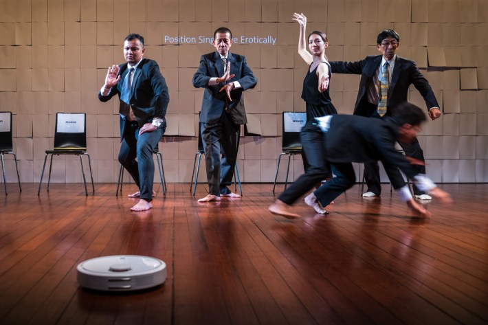 Journey to Nowhere 构建了一个“艺术家成为公务员”的想象。我们看到的是披上公务员外衣的艺术家们不流畅的动作。领带、贴身的外套以及坚硬的皮箱让肢体无法充分开展。它们是艺术家进行实验和探索的阻碍。它们使艺术家失败了无法重新再来。Soultari Amin Farid 和 Nget Rady 经过两轮的学习和切磋后不欢而散。清水宽二和 Didik Nini Thowok 手拿着皮箱舞动一番后把它放下,无奈和不知所措地望着它。陈美锜身段柔美却只能做像演出前广播那样制式又僵硬的动作。政策的推行没有实验或失败的可能,只有严格遵从指示。这一切都让现场最资浅的雷晴雯看在眼里。她从一开始就坐在椅子上观望,从观众席移到台边的角落,再到台上各个位置,都是静静坐着,不敢轻举妄动。直到与 Amin 进行问答时,她才透露心声,并以她最擅长的音乐回应了之前所见,但她的琴声透露出焦虑的情绪。接着,五位艺术家集体出动,步伐谨慎但极富自信,肢体风格各异但彼此拥有默契,眼看就要开创新局面,一名“公务员”带来了新成员:一台扫地机器人。它在众人脚下横冲直撞,干扰艺术家的脚步,吸引观众的目光。具备学习功能的它,正以高效率熟悉这个环境,回应这个空间。于是艺术家们退却,慢慢回到原来的位子上,遥望前方。科技,赢了艺术,赢了人类。难道,科技会为我们达成“启发”、“连接”和“定位”?