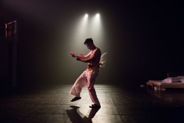 但另一方面,相比剧本,台湾演出版本呈现出更大胆且充满感官声色的刺激,但也因此丰富了戏剧内容。比如:加入观音小塑像这一道具。一开场男主角强就把观音用红绳吊起来。而在戏剧最后一场,导演又将男主角改成是被红绳捆绑吊起身体(而非原剧本中的“被麻绳捆绑在椅子上”),除了在黑盒剧场空间中增加了演员身体的视觉表现力以外,还与第一场呼应,强化了一种人体被吊挂的惊悚效果。且这样的悬吊表演,更富有情色情欲意涵,也将第一幕的观音形象的宗教神圣性“祛魅化”,而使之“情色化”。又如,在第二场,强要强行对明进行性爱活动的时候,近乎直接呈现(全裸上身,没有脱掉内裤)了男同志间的肛交场面长达2分钟以上,突显男同志作为情欲主体的情欲释放。