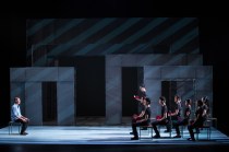 “文字”的眼神凌厉,身体摆出架势,好像得到一种力量,一种单纯躺在书本纸张上没有的力量。人物在表演区中间,“文字”围绕在旁边,摆出各种阵势,仿佛谨慎监督着剧情发展。看到这些画面,我在想,这是文学伴随着剧场,还是两者合作,抑或文学操纵着剧场?